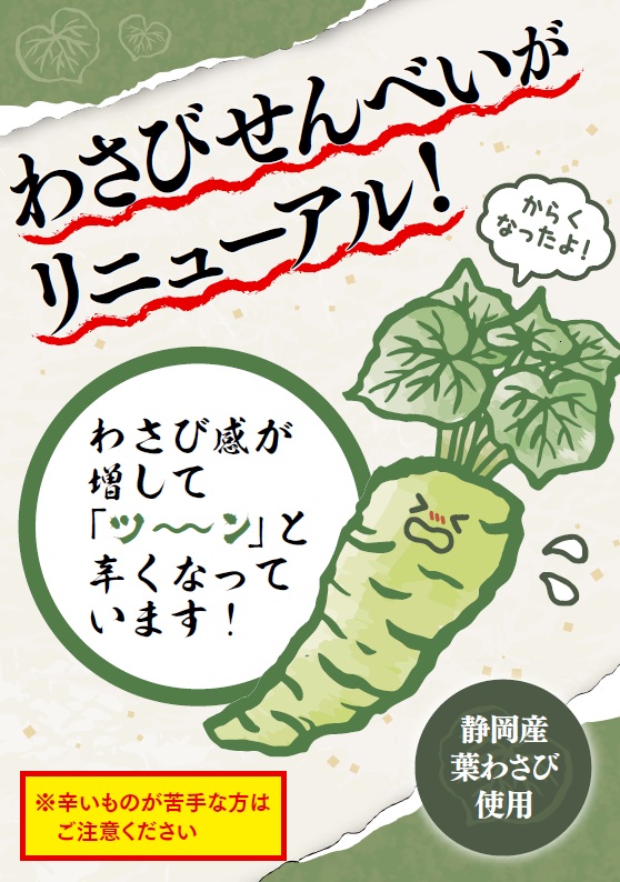 わさび感が増し、食べた瞬間は本物のわさびを食べたようにツーンと辛く、その瞬間にわさびの風味が鼻を抜け、でもあと味はスッと消えるさっぱりしたわさびせんべいです。